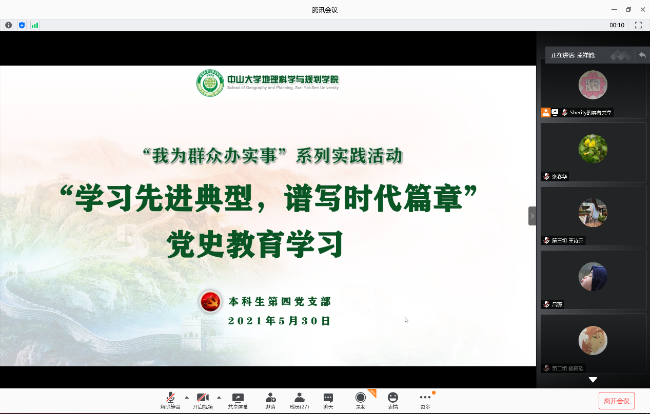 2021年5月30日上午10时,为汲取榜样力量,弘扬先辈精神,进一步巩固“学四史”阶段性学习成果,落实“我为群众办实事”工作安排,地理科学与规划学院本科第四党支部开展了“学习先进典型,谱写时代篇章”党史学习教育主题党日活动。