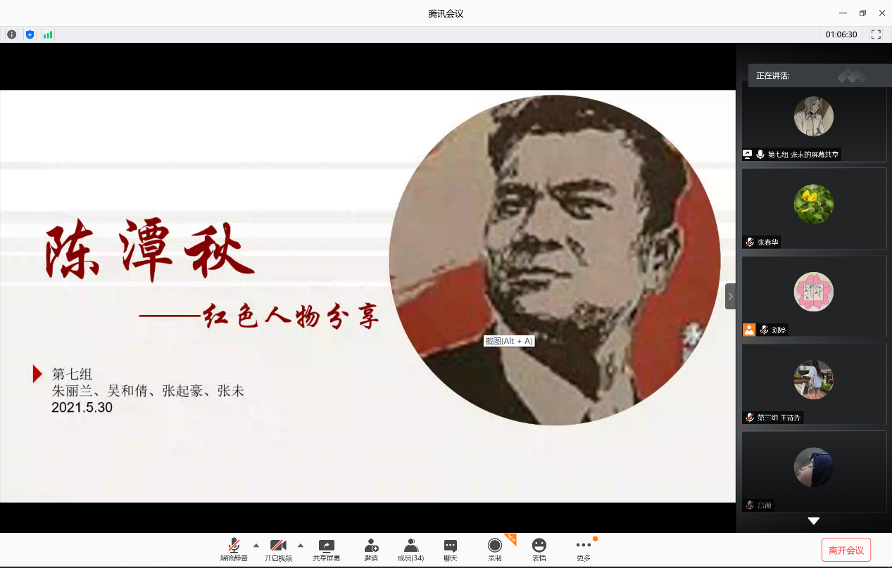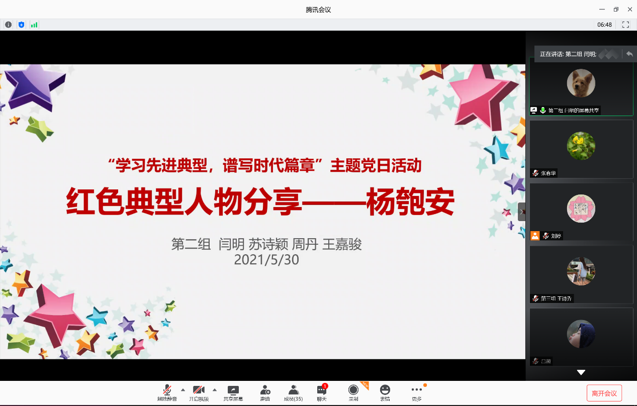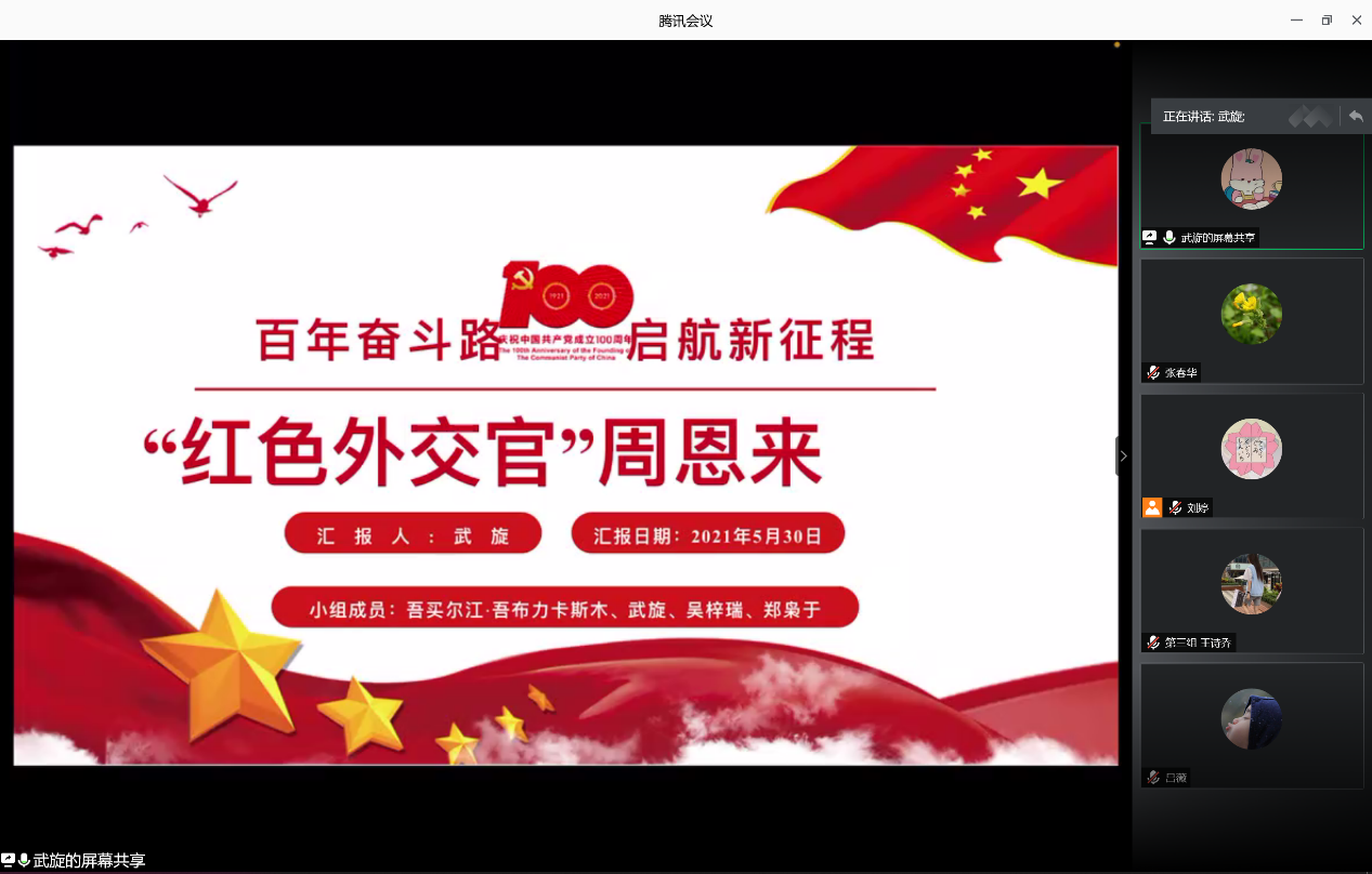 分享前,吕薇同志简要介绍了本次活动的前期准备和工作安排。随后七个小组根据时事政治、地理背景和小组兴趣依次进行了题为《红色典型人物杨匏安》、《抗疫英雄张伯礼》、《纪念赵一曼》、《“红色外交官”周恩来》、《走进<啊摇篮>背后的故事——抗战时期中央托儿所从成立到成功大转移的伟大历程》、《致敬杂交水稻之父袁隆平》、《红色人物陈潭秋》的先进典型和党史分享。
