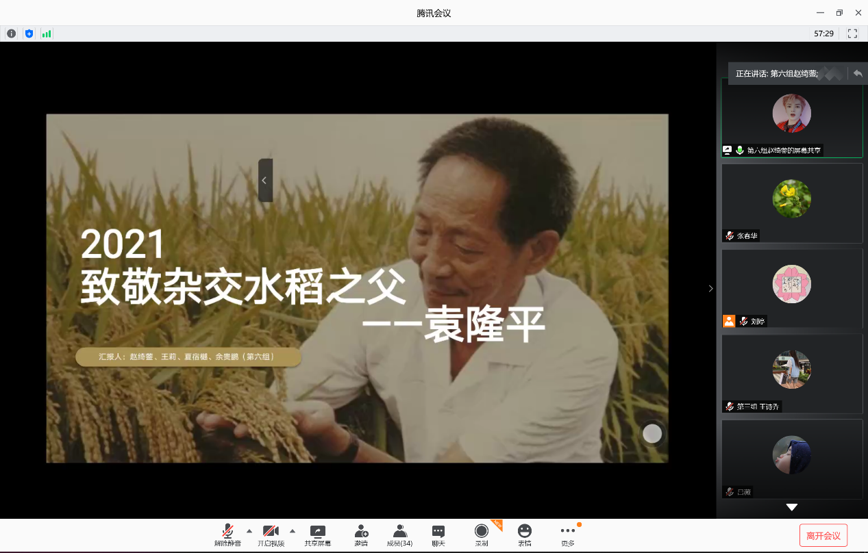 第六小组介绍了杂交水稻之父袁隆平院士,他一辈子只做了一件事,却喂饱了全世界21%的人,不久前的5月22日他永远离开了我们习近平总书记发出向袁隆平院士学习的号召。通过介绍袁隆平院士的生平、他的初心、他的梦想,大家学习他热爱党、热爱祖国、热爱人民,信念坚定、矢志不渝,勇于创新、朴实无华的高贵平直,学习他以祖国和人民需要为己任,以奉献祖国和人民为目标,一辈子躬耕田野,脚踏实地把科技论文写在祖国大地上的崇高风范,更坚定了努力学习报效祖国的信念。