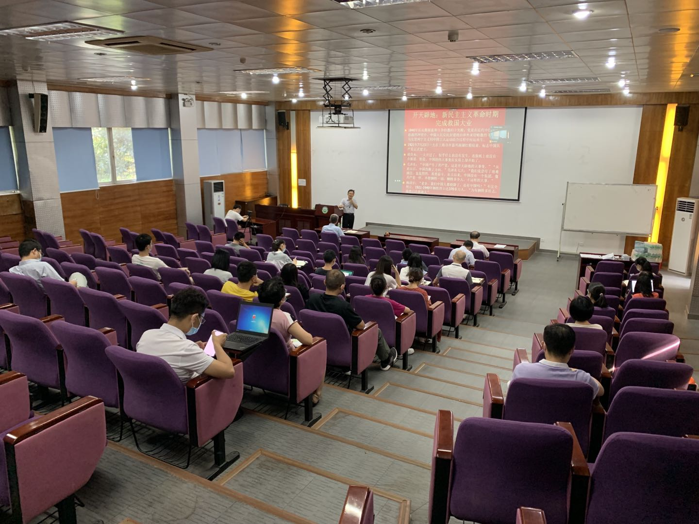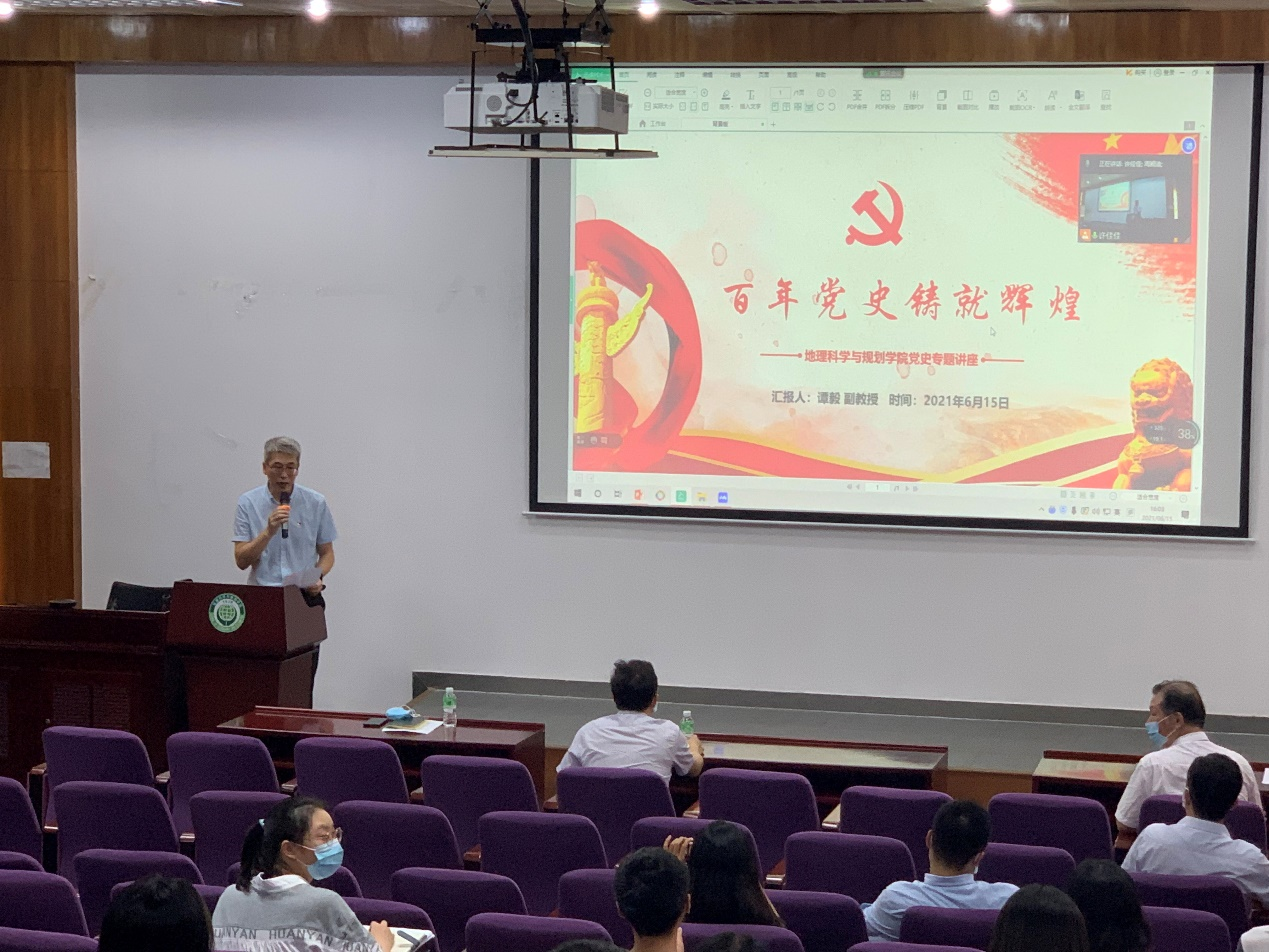 2021年6月15日下午,地理科学与规划学院邀请马克思主义学院谭毅副教授以“百年党史铸就辉煌”为题,在地环大楼D129会议室作党史学习教育专题报告。学院党委理论学习中心组全体成员、师生党支部支委近40人现场参会,全院师生党员、入党积极分子150余人线上同步学习。