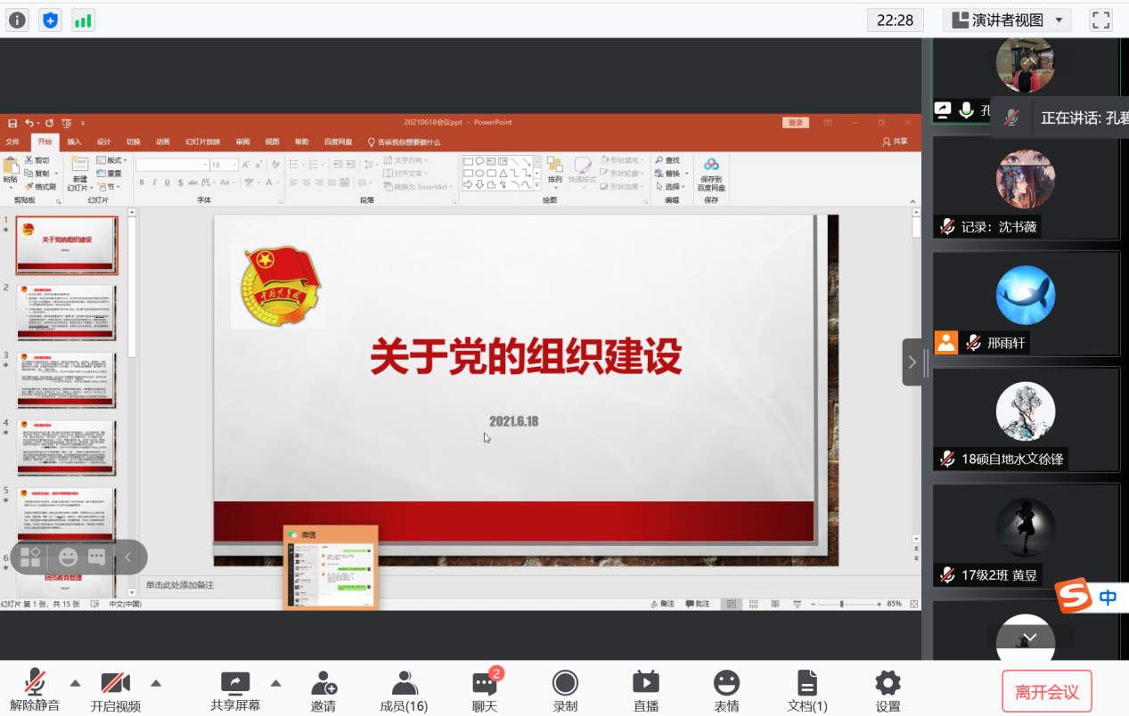 2021年6月18日,地理科学与规划学院毕业班团支部书记专题工作培训会议于线上召开,学院团委书记孔碧云老师,团委学生兼职副书记邢雨轩,兼职辅导员董妍君及全院毕业班团支部书记出席会议,会议由团委书记孔碧云老师主持。