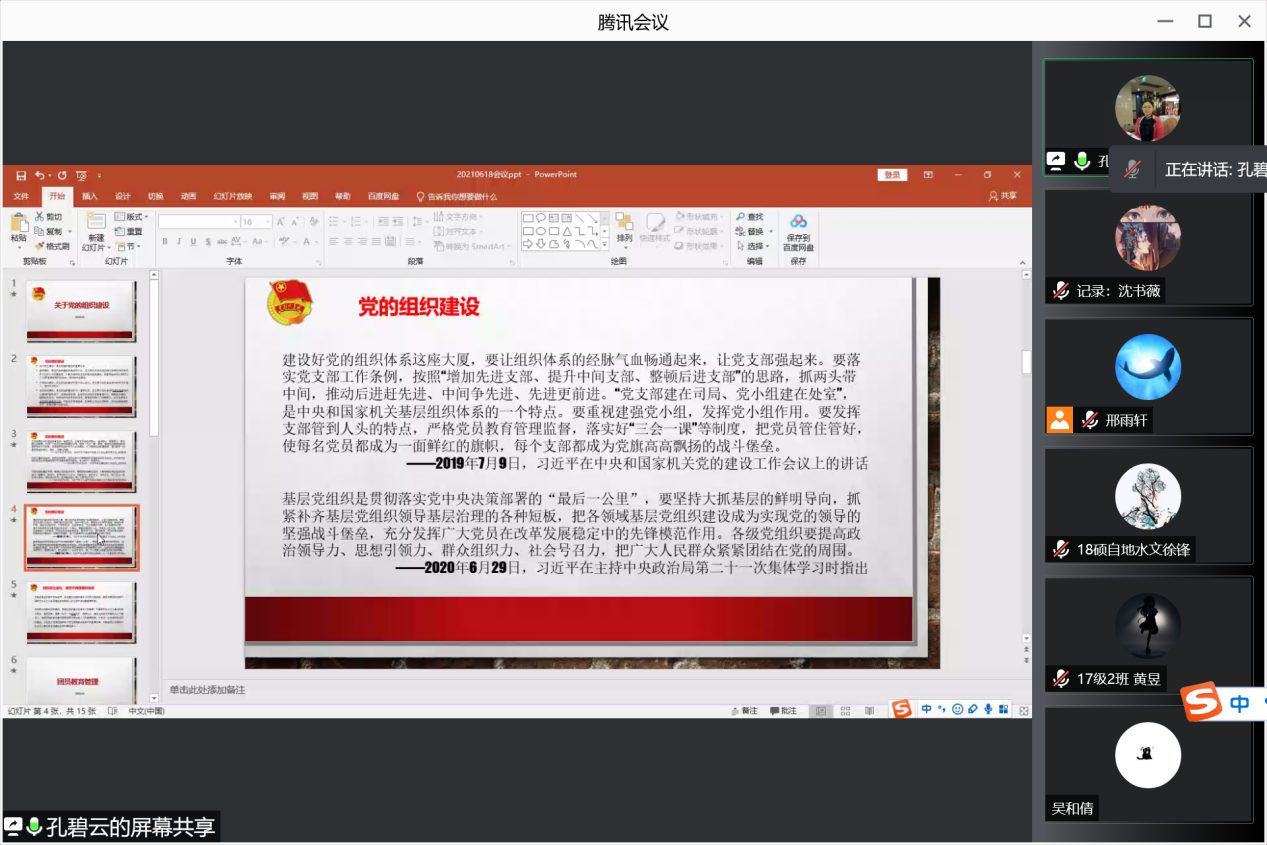 会议进程第一项,由团委书记孔碧云老师向大家讲授团课。她从党的组织建设谈起,领学《习近平在中央和国家机关党的建设工作会议上的讲话》及《习近平在主持中央政治局第二十一次集体学习时发表讲话》并指出加强团员教育管理的重要性。