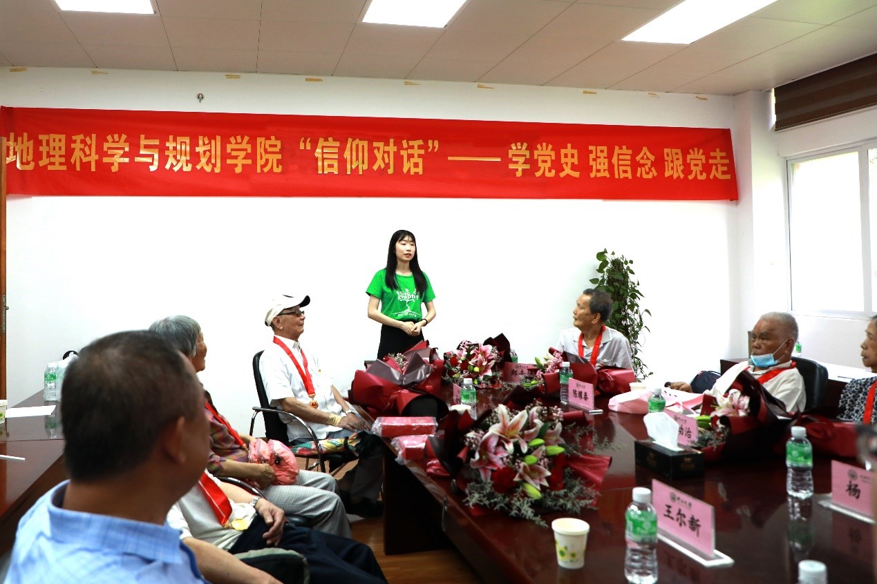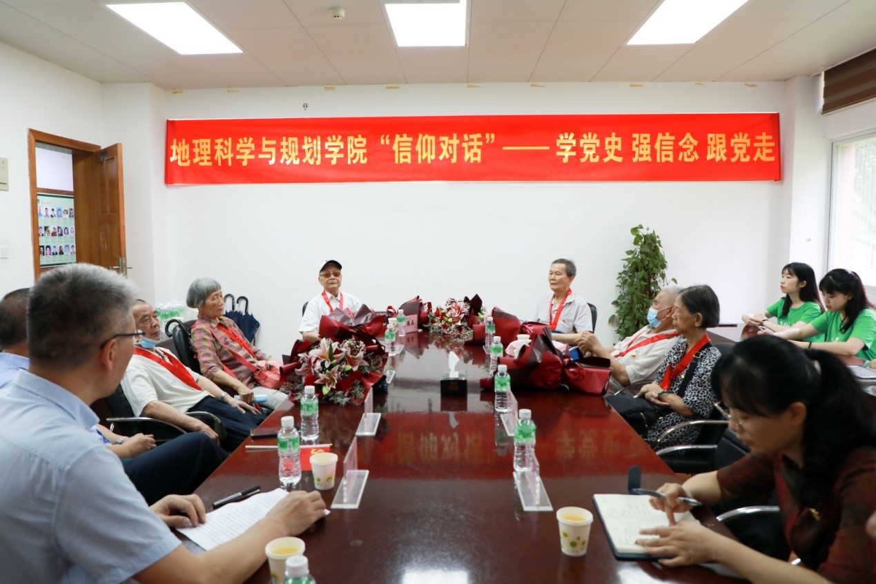 在中国共产党百年华诞之际,为进一步发挥我院老党员在青年党员中的示范引领作用,培养我院青年党员爱党、爱国情怀,2021年6月22日上午,地理科学与规划学院党委举办了“信仰对话”活动。获得“光荣在党50年”纪念章的老党员代表关履基同志、郑去敌同志、叶锦昭同志、徐味娇同志、吕幼治同志、陈耀泰同志与青年党员一起畅谈入党历程,分享人生感悟。学校离退休党工委书记杨云同志、党建组织员王尔新同志、学院党委书记岳辉同志、副书记张春华同志、副院长刘丙军同志出席座谈会,学院本硕支部预备党员代表参与了此次座谈会。座谈会由学院党委书记岳辉同志主持。