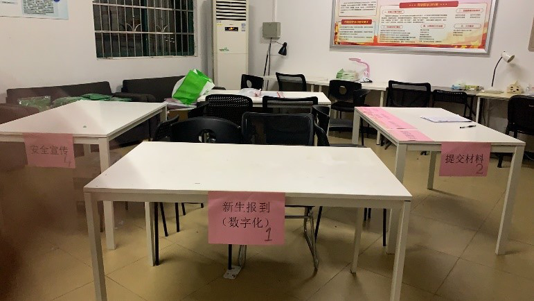 为给新生提供周到的服务,我院研究生会的工作人员和志愿者分别对迎新现场明德园1号一层文化室、至善园2号一层文化室进行了温馨的布置。报道流程分为四个模块:新生报到(数字化迎新)、收集材料、领取材料以及安全宣传。工作人员在新生报道现场张贴指引标志、整理防疫包和院服等物资,营造贴心迎新环境。