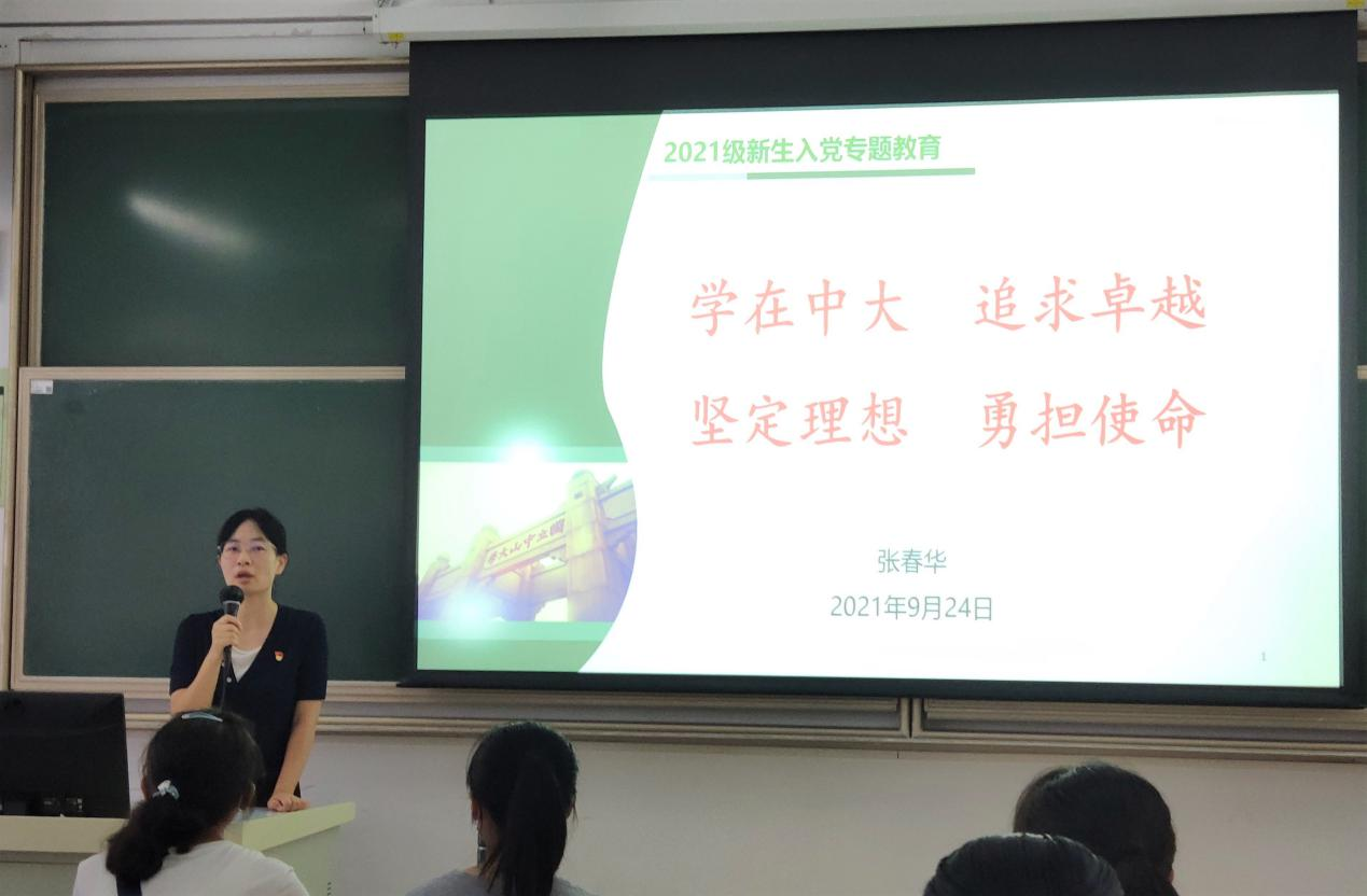 9月24日上午,学院党委张春华副书记以 “学在中大、追求卓越、坚定理想、勇担使命”为主题,首先带领大家简要回顾了yl9193永利集团的办学历史和发展历程,着重讲述了学校的优良传统和红色基因,鼓励同学们要铭记红色历史、勇担历史使命,将个人理想与祖国发展联系在一起。接着,张春华副书记讲述了自己对入党的理解,着重强调同学们要积极通过学习党章、党史来认识党,要积极向党组织靠拢,并向同学们介绍了入党的流程。
