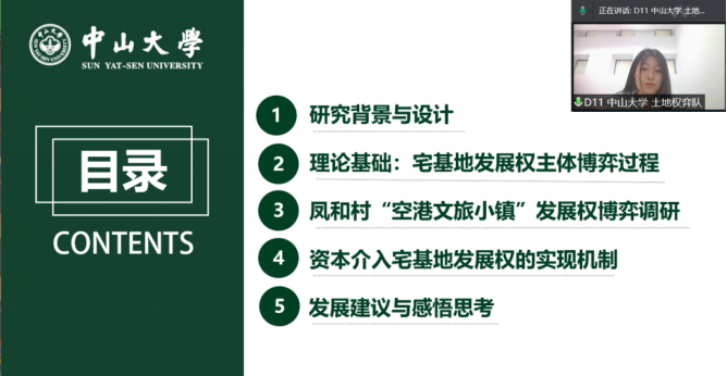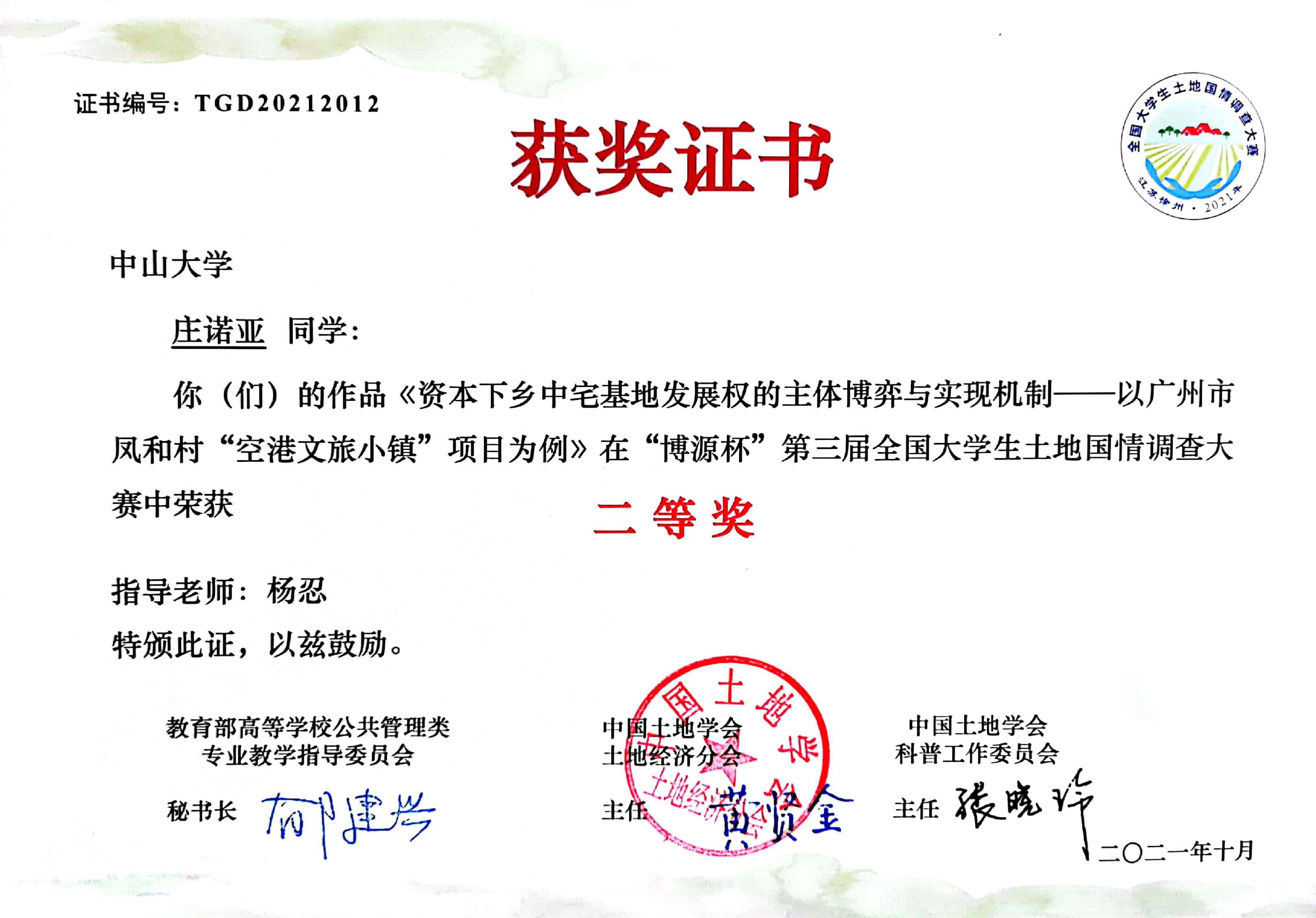 2021年9月初,庄诺亚在杨忍老师的指导下进行选题参赛。基于自身对宅基地“三权分置”政策及资本下乡中土地流转过程的兴趣,结合此前调研经历,庄诺亚选取了广州市都市边缘村凤和村作为调查案例,对凤和村“空港文旅小镇”项目建设中的宅基地租赁过程与机制展开探讨。通过深度访谈凤和村村委会曹主任、迅和港公司许主任以及凤和村村民,庄诺亚对凤和村宅基地流转、农房微改造与利益分配过程进行了全面的实地调研,获取了大量的一手资料;并在调研结束后,通过查阅学术文献与政府文件,结合自身思考完成了报告的写作,并按时提交了初赛作品。在决赛阶段,庄诺亚在杨忍老师指导下,针对报告内容完成了宣传海报和ppt的制作与完善。此外通过咨询去过凤和村调研以及具有往届获奖经历的师兄师姐——尤其是陆进锋同学给予了重要经验传授,庄诺亚在决赛阶段获得较大提升。10月17日下午,庄诺亚成功完成了汇报,取得二等奖的佳绩。