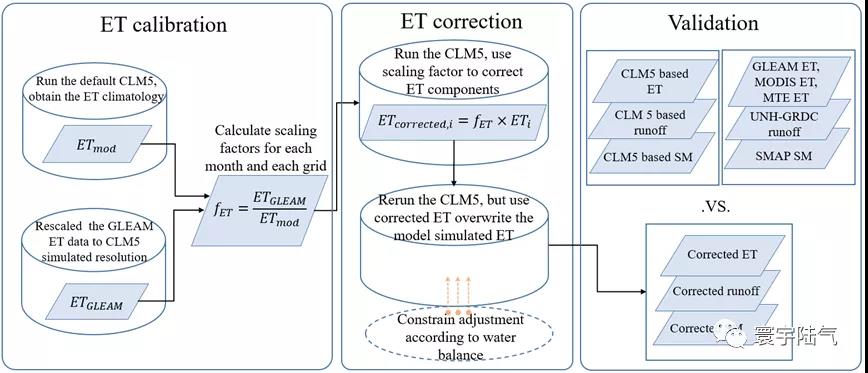 ①选取GLEAM ET作为基于遥感的蒸散发数据。通过率定期的GLEAM ET和CLM5模拟的ET计算校正因子(f ET)。