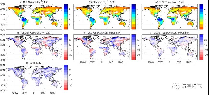 图1. 为校正前后的多年平均ET的对比,校正前为CLM,校正后为CLMET。从图(a-c)可以看到校正前后ET的空间变化,图(d-f)可以看到,以GLEAM为参考(Reference),校正后的ET在空间分布上有明显的改善和提升。