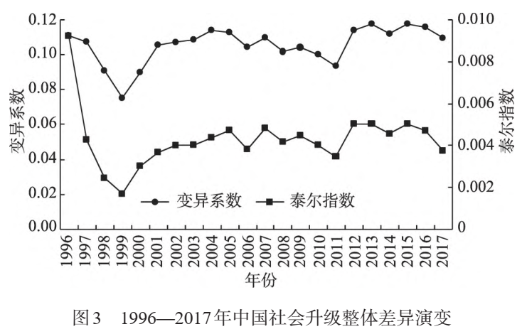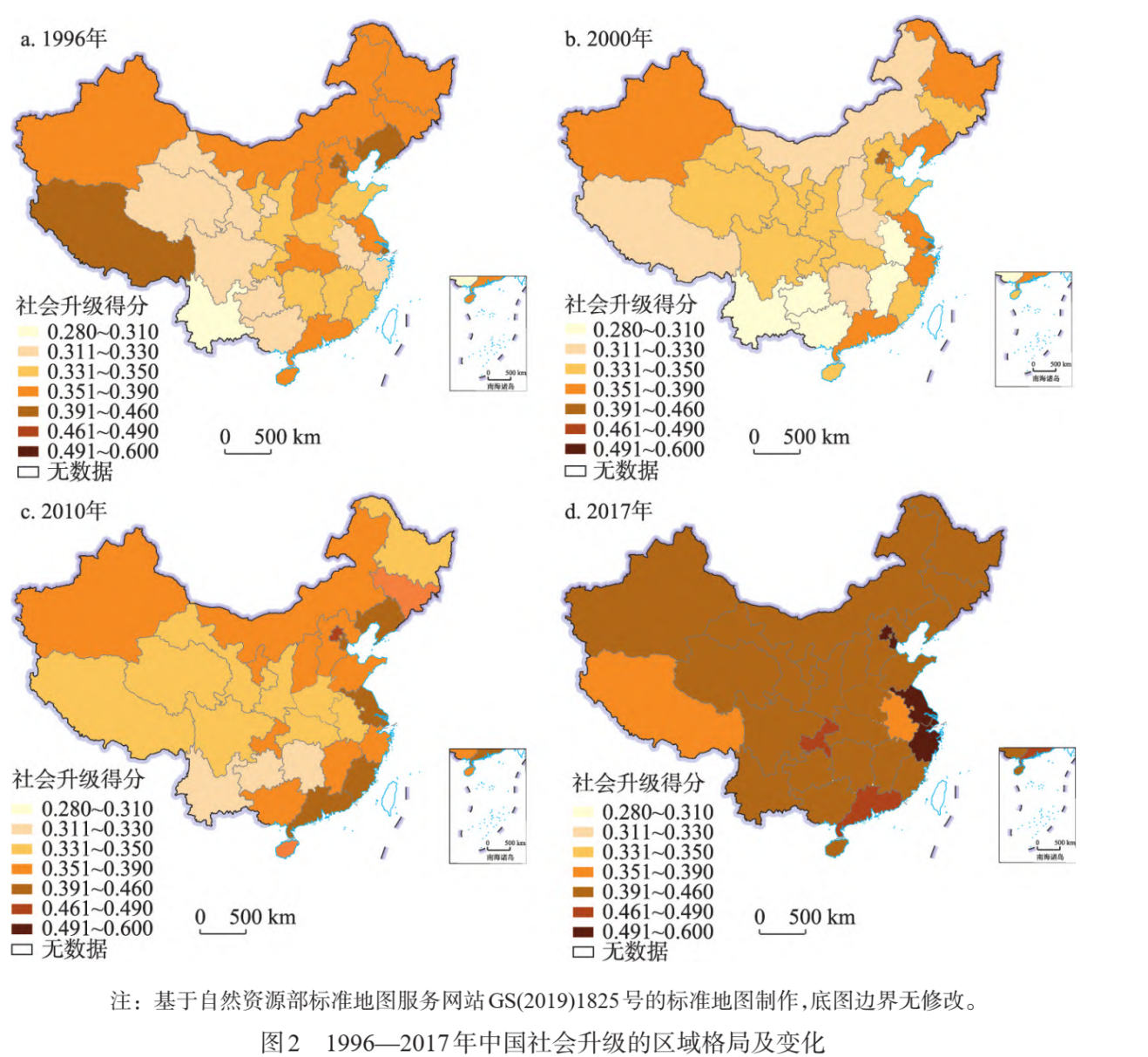 该研究建立了社会升级的综合测度指标体系,揭示了20世纪90年代中期以来中国社会升级的时空格局、区域差异和影响因素,检验和探明了经济升级、经济全球化和政府治理等3种关键因素对社会升级的影响,特别是将产业创新因素纳入考虑,促进了对经济发展、经济全球化与社会升级关系的理解。研究发现,1996-2017年期间中国总体的社会升级状况得到改善,但面临区域发展的不平衡问题(图1)。东部地区是社会升级的主要区域,其中又以京津冀、长三角、珠三角等三大城市群为核心升级区(图2)。尽管社会升级在全国整体和地区尺度的区域差异有所缩小(图3),省际发展分化速率得到一定缓解,中西部省份逐步追赶东部省份,重庆的发展引人注目,但东部沿海仍是带动中国社会升级的主导区。