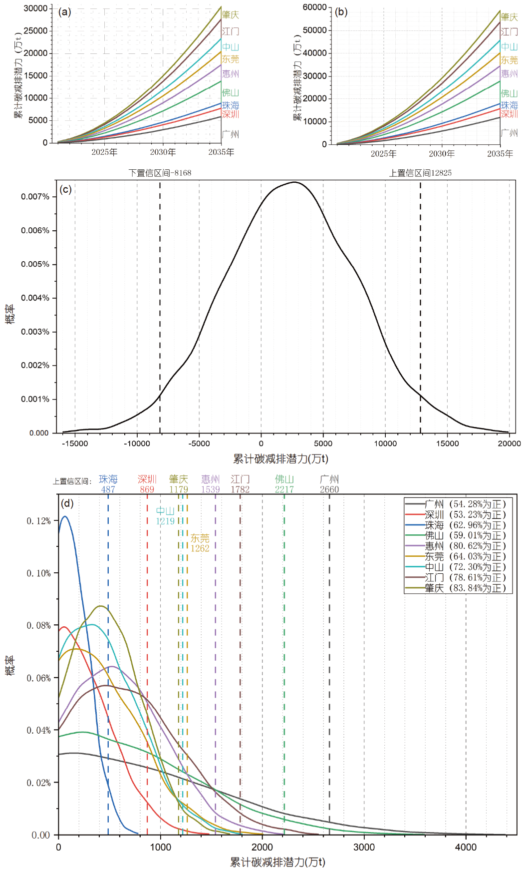 珠三角城市群累计碳减排潜力为−8168万~12825万t(图2c),66.79%的概率实现进一步碳减排且2744万t碳减排量的概率最高。对于城市而言,早实现碳达峰的城市潜力较小,曲线相对集中(图2d),碳减排边际潜力随时间推移不断增大,因此尽早实现城市碳达峰将更大程度提高碳减排量。