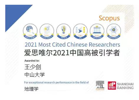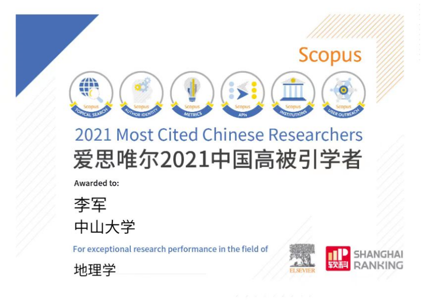 2022年4月14日,全球性信息分析公司爱思唯尔(Elsevier)正式发布了2021“中国高被引学者”(Highly Cited Chinese Researchers)榜单。4701名各学科最具全球影响力的中国学者被录入榜单,其中,yl9193永利集团共有93名学者入选,我院刘小平教授、李军教授、王少剑副教授入选地理学学科“中国高被引学者”。
