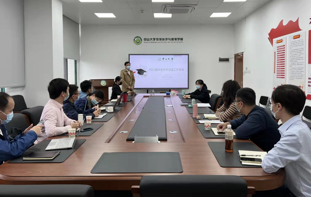首先,毕业班辅导员欧金沛老师做2022届学生升学深造工作报告,欧老师从保研、境内考研和境外留学三个方面回顾和总结了升学深造的工作流程和内容,明确辅导员在学生升学深造的各个阶段应尽的职责;对2022届学生升学深造情况进行了统计,并从今年与往年同期数据对比、意向升学与实际录取情况、考研成功率、调剂情况等方面做了详细的分析;最后指出,2022届本科生同期深造落实率、考研成功率相比往年有较大提升,同时也提出在前期考研动员、校外考研指导、境外升学帮扶等方面仍需进一步改进。