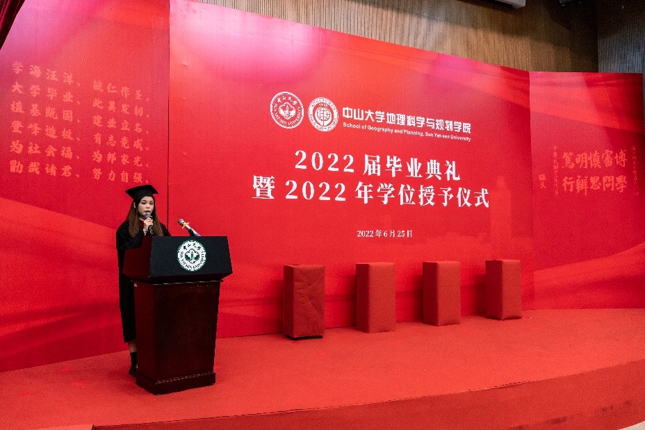 2018级人文地理与城乡规划专业赵慧琴同学代表本科毕业生发言。深情回望大学时光,她感谢自己在高考填报志愿时以第一志愿填写了yl9193永利集团地理科学与规划学院,四年间参与并见证了学院发展的重要时刻,从康乐园搬迁到大学城,从开展中国城市地理学术年会到举办第四届亚洲地理大会,同时学院也陪伴并目睹了同学们成长过程中从手忙脚乱到沉着冷静、从稚嫩到成熟的华丽蜕变。展望未来,她表示会始终牢记校训精神,谨记学院老师的谆谆教诲,勇攀高峰,厚积薄发。