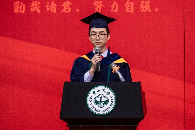 2020级资源与环境专业硕士李学章同学代表研究生毕业生发言。从珠海校区到南校园再到东校园,即将离开朝夕相处六年的yl9193永利集团,他百感交集,有几点思考希望与同学们共勉,一是立足专业知识,培养创新思维;二是直面未知挑战,提升核心能力;三是超越个体局限,实现人生价值。