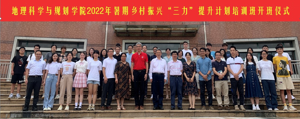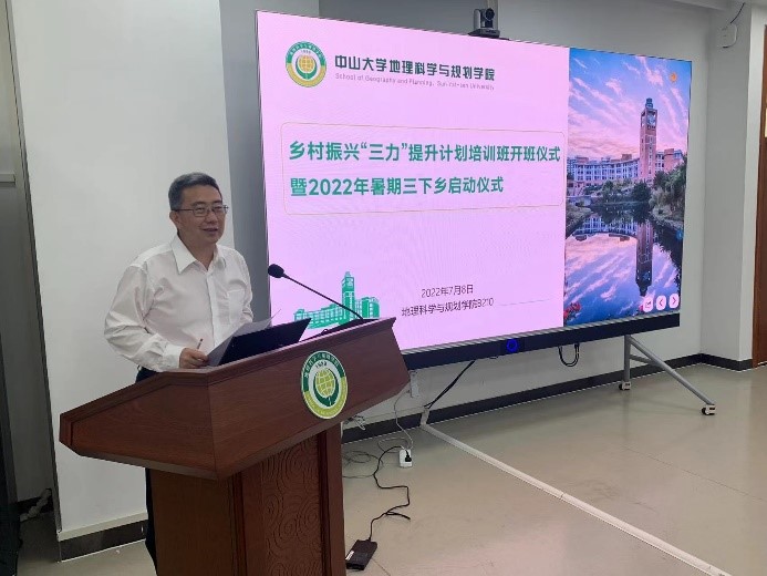 2022年7月8日下午,地理科学与规划学院在学院B210会议室举行2022年暑期乡村振兴“三力”提升计划培训班开班仪式暨三下乡启动仪式。院长薛德升教授、学院党委岳辉书记、副院长马育军副教授,此次培训全体教师团队出席仪式,培训班33名学员参加仪式,仪式由党委副书记张春华主持。