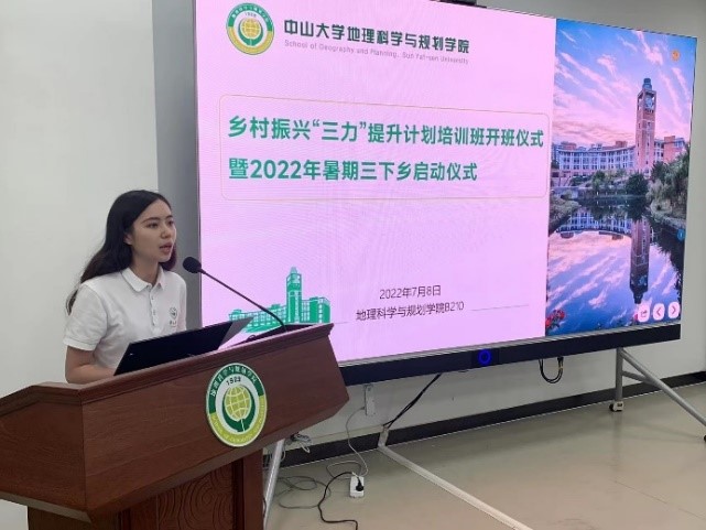 接着,学生代表颜嘉玲同学发言。颜嘉玲同学表示,在过去一年支教志愿服务的实践中对乡村振兴的意义有了很深的体会,青年人承载着党和国家的殷切期望,理应勇担时代使命,成为建设社会主义现代化的中流砥柱,她相信同学们将在此次培训中努力研学、积极实践,用实际行动践行地理学子的家国情怀。