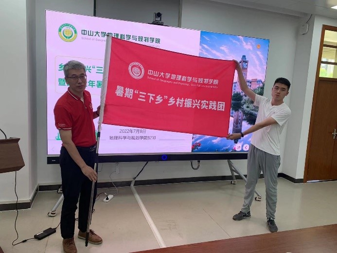 张春华副书记宣布了班委名单。岳辉书记将鲜艳的“三下乡”队旗授予培训班班长林卫银同学手中,吹响了2022年学院暑期课程实践的出征号角。