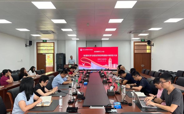2023年7月7日下午,地理科学与规划学院在学院大楼B210召开全院教职工大会暨“师德集中学习教育”专题会,通报学院主题教育工作进展,并开展师德师风集中学习教育,学院教职工80余人以线上线下结合的方式参加会议。