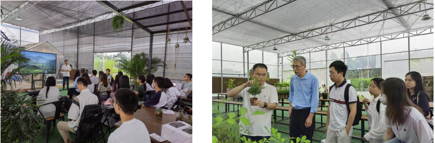 师生一行首先到达赤坭镇广州东润农业生态旅游有限公司(以下简称“东润农旅”)参观学习。中大校友、东润农旅董事长庄文杰为师生们介绍了东润农旅公司积极参与赤坭镇乡村振兴建设的情况。该公司深入贯彻落实党中央、国务院全面推进乡村振兴战略部署,通过花都·赤坭盆景产业等项目,为乡村产业全方位赋能,推动乡村业务与乡村振兴共同实现高质量发展。同时,庄文杰校友介绍如何通过盆景相关的研学活动促进乡村振兴,并讲解修剪枝条、打造微景观等实操要点,邀请师生亲自体验绿植微景观制作过程,极大提升师生们的体验感和参与感。通过庄文杰校友的介绍和实地参观,同学们真切地感受到乡村振兴具有的广阔前景和勃勃生机。