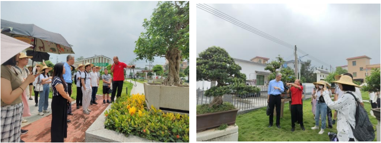 为加深对瑞岭盆景产业发展的了解,师生们参观了集盆景创作、展示、销售、旅游观光于一体的岭南盆景大师园和十佳盆景精品园。姚标民书记向大家讲解了优秀盆景作品的寓意及制作过程,并表示在乡村振兴政策的大力支持下,瑞岭村通过盆景大师进村、盆景艺术节和数字农业直播节等新形式真正做到了留住人才,延伸产业链,造福于民,助推盆景产业高质量发展,让“小盆景”撬动“大产业”,铺就“致富路”。