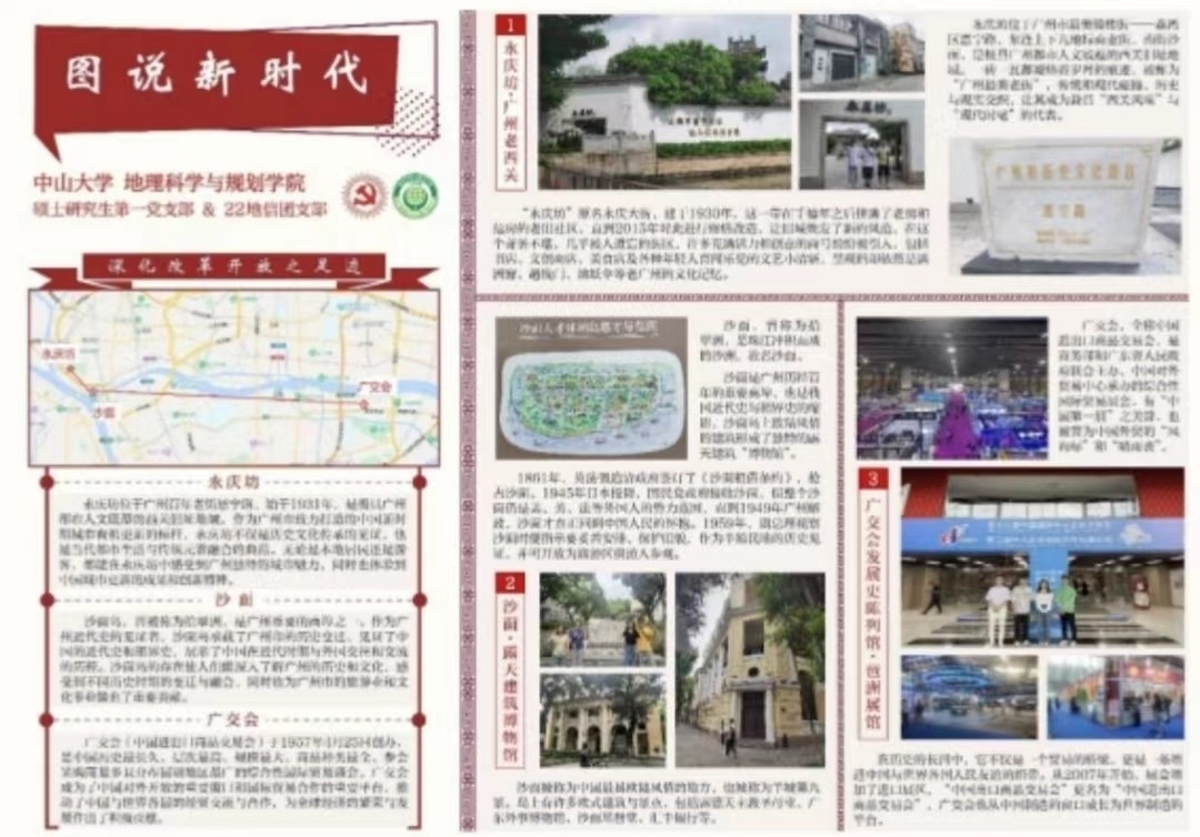 这次党日活动我们踏上广州深化改革开放的路线,在此次寻访沙面的过程中,我了解到沙面作为广州近代史的见证者,承载着广州的历史变迁,也深刻感受到今天幸福生活的来之不易。此次活动以绘制专题地图的形式发挥了我们专业的特长,鼓励我们用实践更直观地体会习近平新时代中国特色社会主义思想的深厚精神内涵。我们应该胸怀祖国、服务人民,坚定理想信念,为实现“中国梦”贡献属于地理人的力量!
