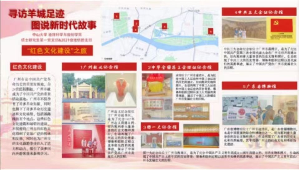为深入开展学习贯彻习近平新时代中国特色社会主义思想主题教育,地理科学与规划学院硕士研究生第一党支部近期开展“寻访羊城足迹,图说新时代故事”主题党日活动,以绘制新时代故事专题地图的形式,深入挖掘广州的红色故事,通过实际体验带领大家深刻领会习近平新时代中国特色社会主义思想的深厚精神内涵。本次党日活动以“党团共建”的形式开展,即以“党小组+团支部”为组成单元,党支部与学院2021级研究生地图学与地理信息系统班团支部结对,对不同路线进行实地寻访后,学生党员及团员利用地图制图专业技术,集成红色教育基地、重大革命历史、革命先辈足迹等内容,绘制“新时代故事红色地图”,在讲述新时代红色故事的同时精进专业知识,在实践中发挥地理专业技能,提升个人价值与党性修养,推动主题教育入脑入心入行。