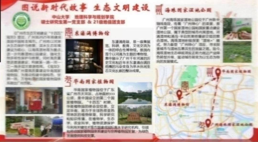 本次主题教育党日活动中,我们小组以生态文明建设为主题,探寻了羊城新时代发展故事。从“臭水沟”迅速转变为城市碧道的东濠涌演绎了现代治水神话,由植物研究所发展为国家植物园的华南国家植物园在植保之路上坚定前行,作为广州“绿心”的海珠国家湿地公园为候鸟迁徙打造平安“驿站”,这一系列生态文明建设硕果都是在中国共产党的领导下实现的,是深入贯彻习近平生态文明思想的成功实践。本小组在此次主题教育党日活动中深刻领悟到,生态兴则文明兴,生态衰则文明衰,人与自然和谐共生。作为地理学专业的党员,我们在探索研究地学理论的同时,也应深入学习习近平新时代中国特色社会主义思想,将本领实践在祖国大地,助力中华民族伟大复兴中国梦!