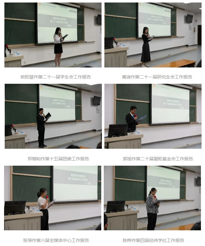 学院第十五届团委、第二十届凝聚基金会、第六届全媒体中心和第四届经纬学社的代表向大会全体代表报告了上一年度的工作情况。