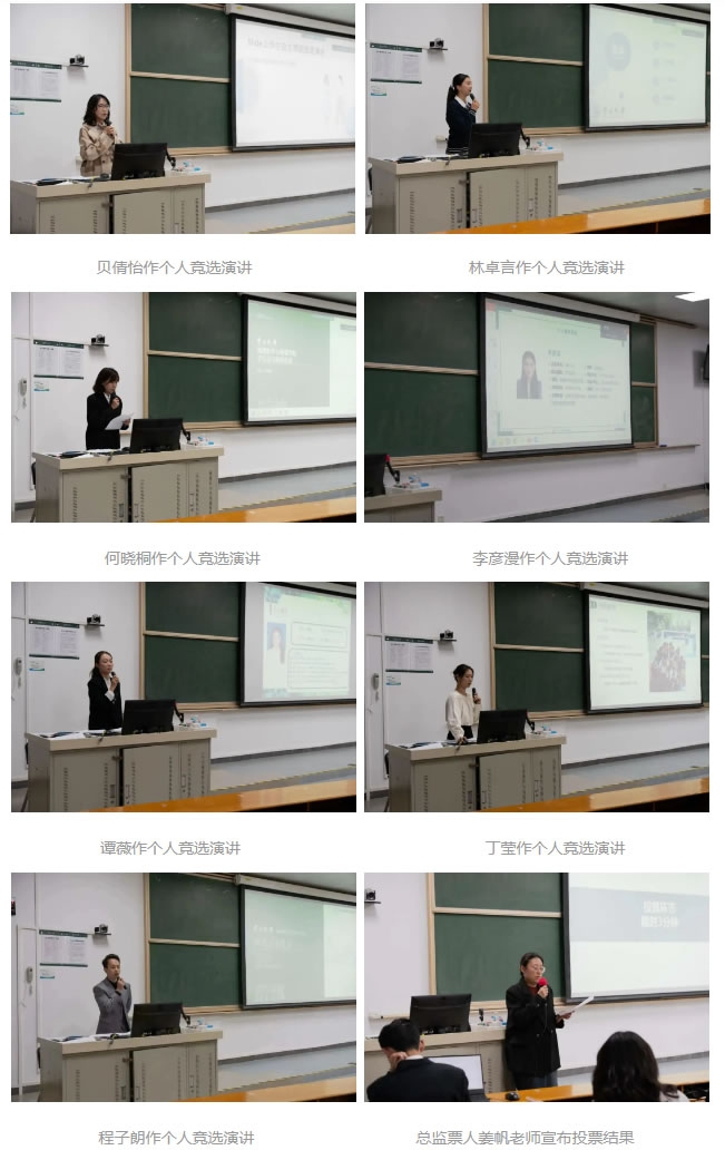 竞选环节,第二十二届学生会主席团成员候选人和研究生会主席团成员候选人共7名同学依次登台,结合自身情况与学生工作经历,对学院学生会与研究生会未来的工作进行规划和设想、提出自己的愿景,并做出认真履职的承诺。根据大会选举办法,贝倩怡、何晓桐当选学院第二十二届学生会主席团成员,丁莹、程子朗、谭薇当选学院第二十二届研究生会主席团成员。