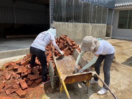 8月14日至16日,翁时秀、陈婷婷、郎嵬三位教师党员和博士研究生龙晔、硕士研究生谭舒颖、吴立坤,与红塘村大围龙党支部成员王华存、郭世生、白大姐等人共同建设小菜园。大家一起搬红砖、理碎石、运水泥,先把小菜园的边界围合起来,接着把小菜园里丛生的杂草清理干净,再搭设活动平台、内部小路,把墙壁装饰得焕然一新。经过三天的共同努力,小菜园已初具规模、干净整齐。在共建小菜园的过程中,两个支部党员也通过沟通和交流增进了认识,为双方共建再上新台阶打下了坚实的基础。