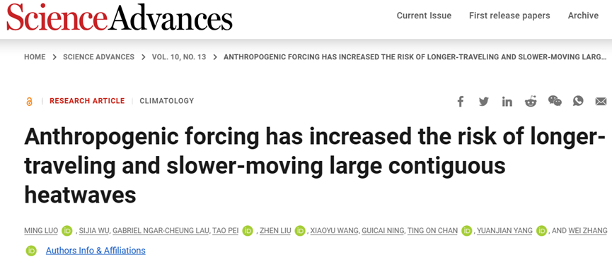 论文引用及链接:Luo, M., Wu, S., Lau, G. N.-C., Pei, T., Liu, Z., Wang, X., Ning, G., Chan, T.O., Yang, Y., Zhang, W., 2024. Anthropogenic forcing has increased the risk of longer-traveling and slower-moving large contiguous heatwaves. Science Advances, 10(13), eadl1598. https://doi.org/10.1126/sciadv.adl1598.