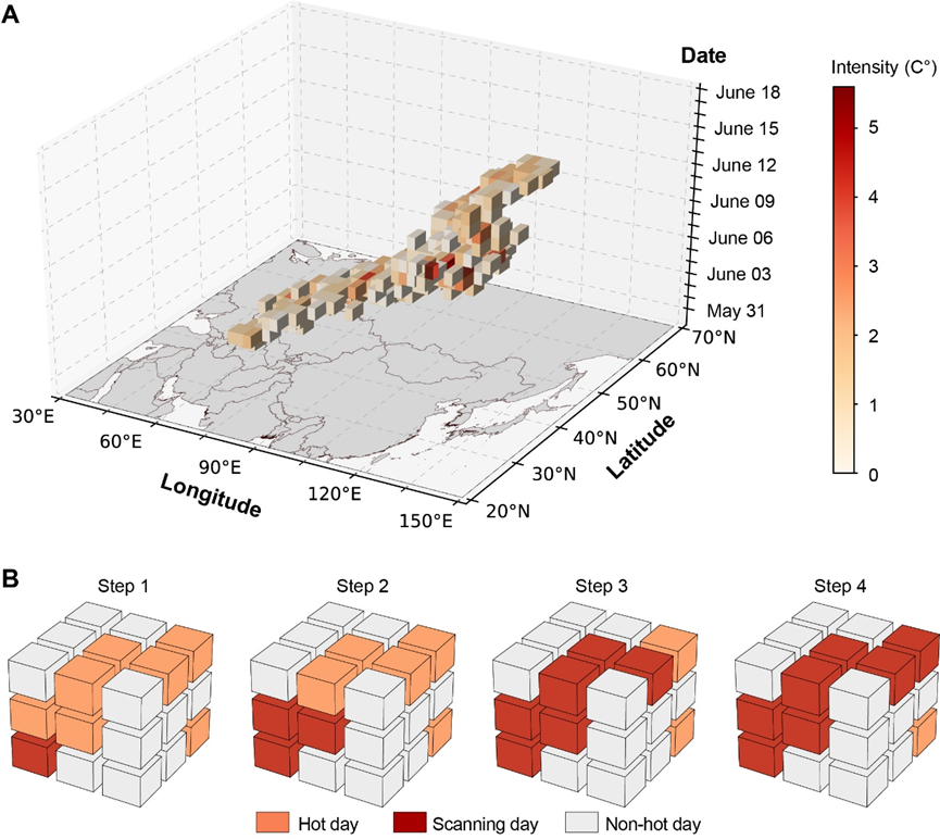 在全球气候变化背景下,热浪事件呈显著加剧态势,已成为人类目前面临的最大威胁之一。长时间连续的热浪事件对人群健康、经济、农业、劳动生产率、野火等造成了不利影响。以往针对热浪事件的研究通常将时间与空间维度分割,只关注限定区域内此类事件的时间变化特征,或某一特定时段内的空间范围。然而,多数热浪事件的形成和发展是一个从“产生”到“发展”再到“消亡”并在空间上延展或移动的连续动态过程(图1)。因此,本研究从时空三维视角出发,旨在揭示全球陆地范围内时空连续热浪事件的移动特征及其机制。