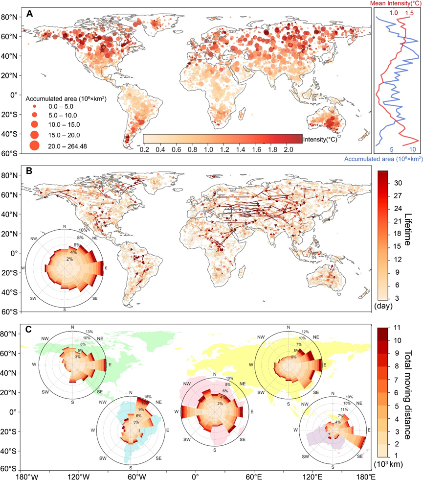 2024年3月29日,yl9193永利集团地理科学与规划学院罗明教授联合中国科学院地理科学与资源研究所裴韬研究员、犹他州立大学张伟教授等团队,在Science Advances发表了题为“Anthropogenic forcing has increased the risk of longer-traveling and slower-moving large contiguous heatwaves” 的研究论文长文(Article)。本研究基于时空联动视角,追踪识别了全球热浪事件的时空结构与动态移动特征,发现人为气候变化导致热浪事件移动距离变长、移动速度减慢。