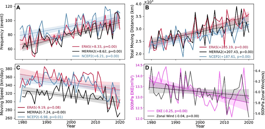 该研究利用多套再分析资料和模式模拟数据追踪识别了时空连续热浪事件,研究其在不同大洲和不同时期的移动特征(移动距离、速度和方向)。研究发现时空连续热浪事件以向东移动为主(图2),1979~2020年间热浪事件的持续时间和移动距离增加,分别从1979~1983年的平均持续时间8天和移动距离2430公里增加到2016~2020年的12天和3400公里,而移动速度显著降低,减慢了超过20%(图3)。这可能是由于涡旋动能和纬向风的减弱,以及人为热强迫产生的温室气体影响所致。自1997年以来,这些变化趋势呈显著加剧态势。气候模拟预测结果表明,如果人为温室气体排放持续增加且不采取有效措施加以控制,这种持续时间更长、移动距离更远且移动速度更慢的连续热浪事件将对人群健康和生态环境造成更严重的影响。该研究从时空联动视角出发,丰富了极端天气气候事件研究的方法体系,对于适应和缓解全球连续热浪事件具有重要意义。