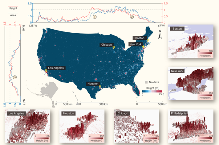 全面、定量地理解城市要素有助于实现联合国2030年“可持续城市和社会”发展目标。建筑物高度是研究居住条件的基础数据,同时也是气候模拟、功能识别、能源消耗等多方面研究所使用的关键要素。然而,现有栅格数据难以准确描述功能多样、场景复杂的城市建筑三维结构,且覆盖范围存在局限。由于三维建筑数据有限,现有研究通常使用建筑面积作为分析居住空间的基础数据,而建筑物的垂直结构较少受到关注。因此,本文利用多源卫星观测数据与建筑足迹数据对2020年美国1.2亿栋建筑物的高度进行提取,揭示了大范围、精细尺度下建筑物高度的空间分布模式,并由此分析了城乡居住空间的差异。