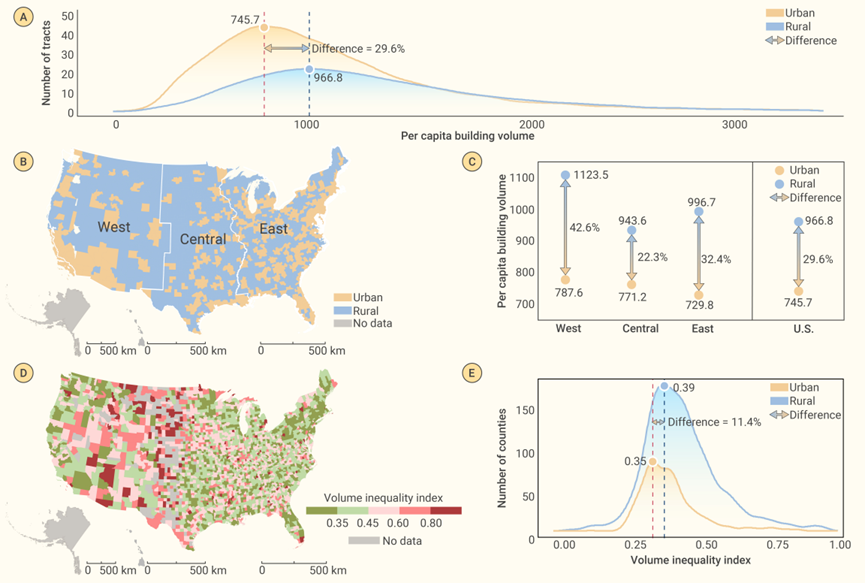 该研究发布的全美逐栋建筑物高度地图揭示了整体上东高西低的分布规律,并发现城市内部从城市中心(平均高度12.4m)至郊区(平均高度5.4m)的普遍距离衰减模式。在质量评估中,该研究发布的数据集以更精细的分辨率显示出更可靠的精度。此外,该研究发现美国城市的人均居住空间(745.7 m3)明显低于乡村(966.8 m3),二者相差30%。美国西部地区的城乡居住空间差异(42.6%)大于东部地区(32.4%)。由于城市更严格的分区方法促进了人均居住空间的公平分配,城市人均居住空间的不平等程度相对于乡村较小,二者差异为11%。同时,考虑建筑物的垂直高度(而非仅考虑建筑面积),美国乡村的人均居住空间比城市大5.5%。该研究为城市可持续发展相关研究提供了重要基础数据,有助于探究人类活动与自然生态系统之间的复杂相互作用。