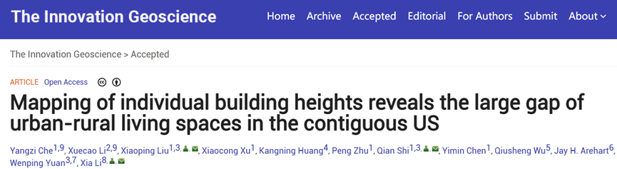 论文引用及链接:Che Y., Li X., Liu X., et al., (2024). Mapping of individual building heights reveals the large gap of urban-rural living spaces in the contiguous US. The Innovation Geoscience2(2),100069. https://doi.org/10.59717/j.xinn-geo.2024.100069