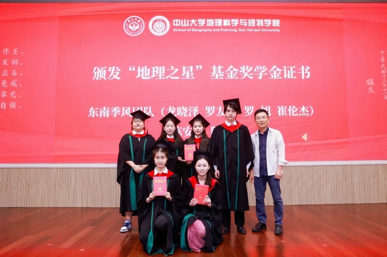 1981级校友陈惠根先生为学院 “地理之星”基金奖学金获得者颁发证书。