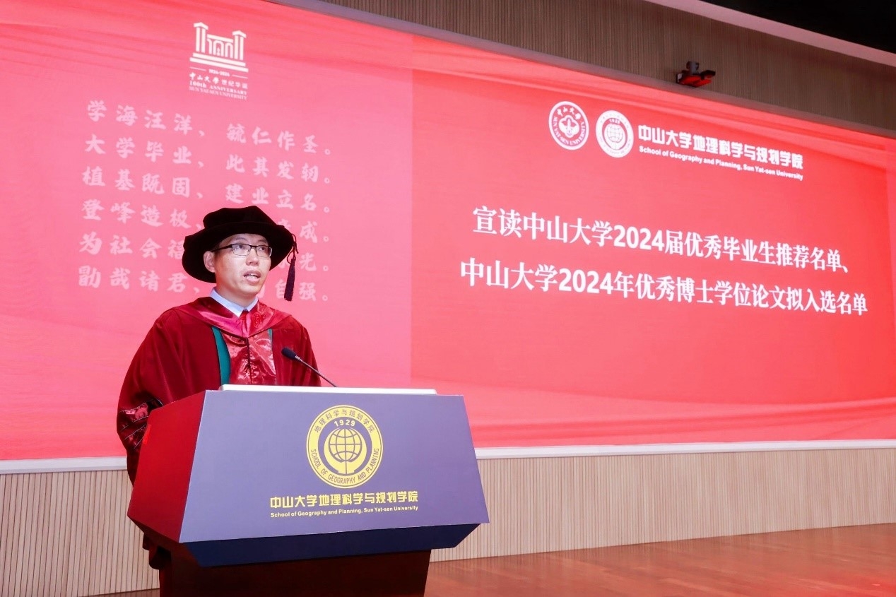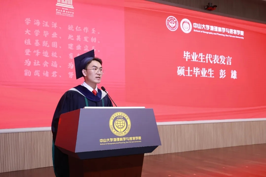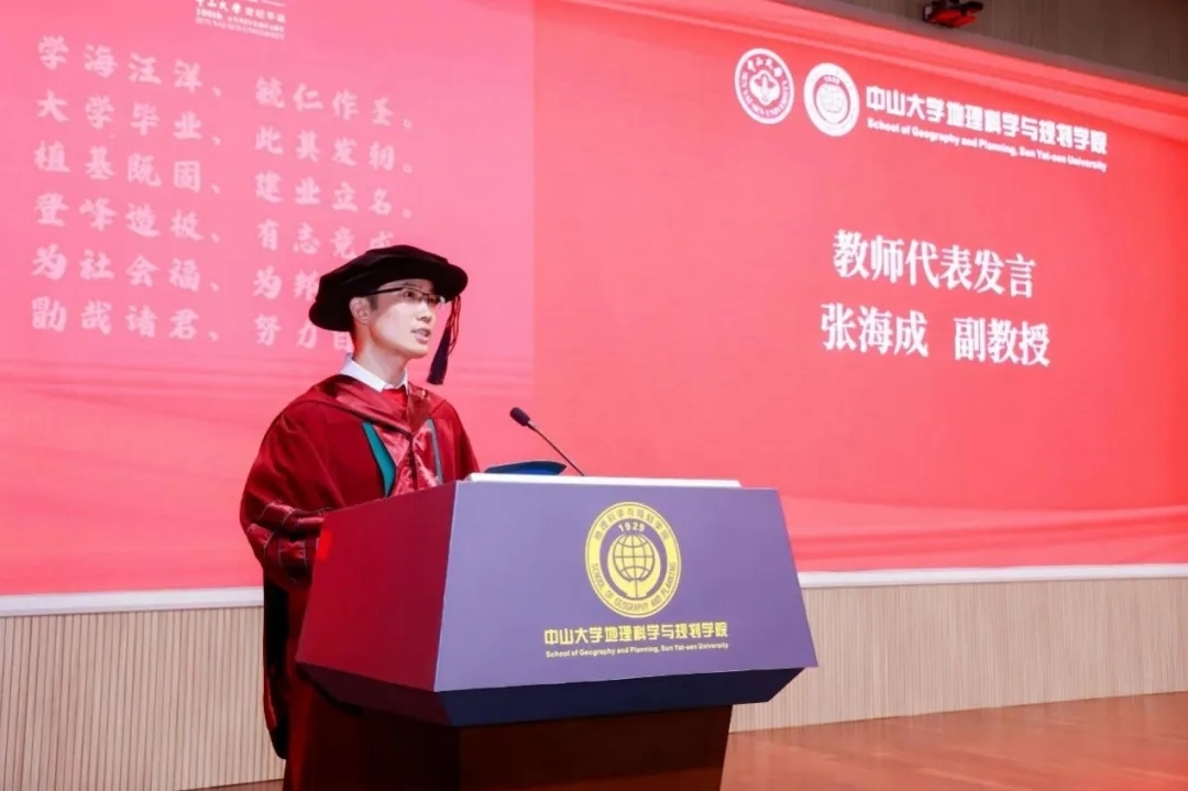 张海成副教授作为教师代表发言。他表示很高兴能够和同学们一起见证荣耀和分享喜悦,更自豪于中大地理学的血脉随着大家共同的拼搏与勤奋刻苦不断传承。作为职场新人,张老师与大家分享了三点体会:是汇,也当为源,今天毕业的同学们已是一个个知识汇、技能汇,相信明天也将是一个知识和技能的源;让我们老得慢一些,希望同学们保持对未知的好奇心,不断学习,不断打磨自己,坚持理想,敢打敢拼、勇往直前;心怀感恩,感恩父母长辈,感恩同学朋友,给予自己平和与自信。最后他祝福同学们前程似锦,共同缔造属于中大的、属于中大地院的辉煌未来。