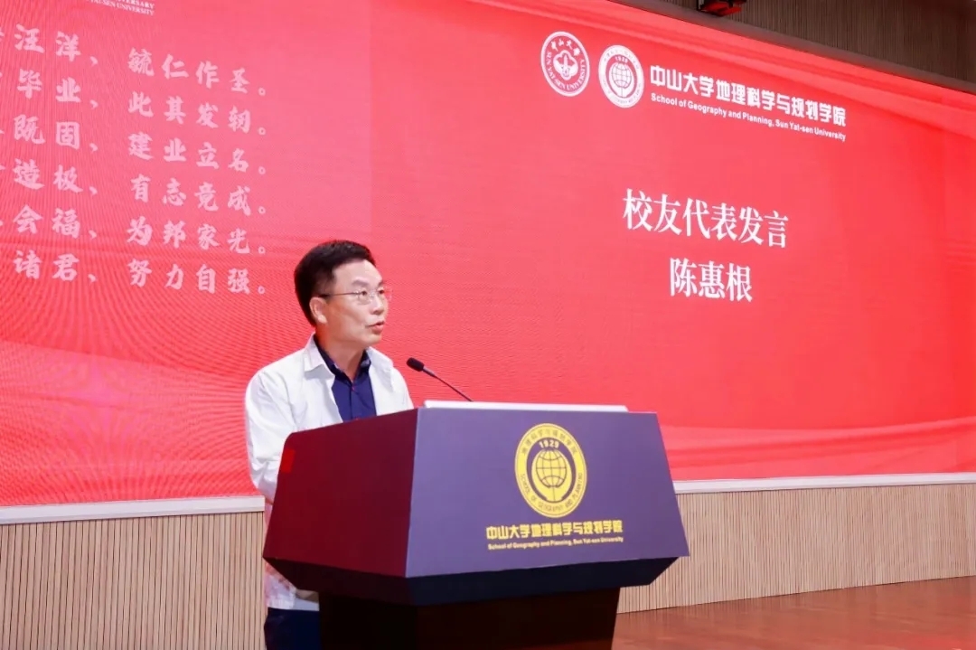 1981级校友陈惠根先生作为校友代表发言。陈学长表示很高兴在中大诞辰100周年之际,重回母校,回到地理学院,见证又一届地理学子毕业。大家在最美好的青春岁月于康乐园相遇、留下深情的回忆、获得优秀的成绩,不能忘记背后老师们的辛勤付出与学院创造的优异的环境。他寄语毕业生们要感恩于伟大的时代,永远不要停下前进的脚步,敢于不断历练自己,为未来的拼搏打下坚实的基础。他希望即将走出校门的同学们,也能在努力拼搏之余,心系学校,校友们一起共同支持学院教育事业的发展。陈学长最后分享了一段环球旅行经历,愿大家发扬地理学毕业生的特质,用脚步去丈量世界!