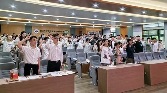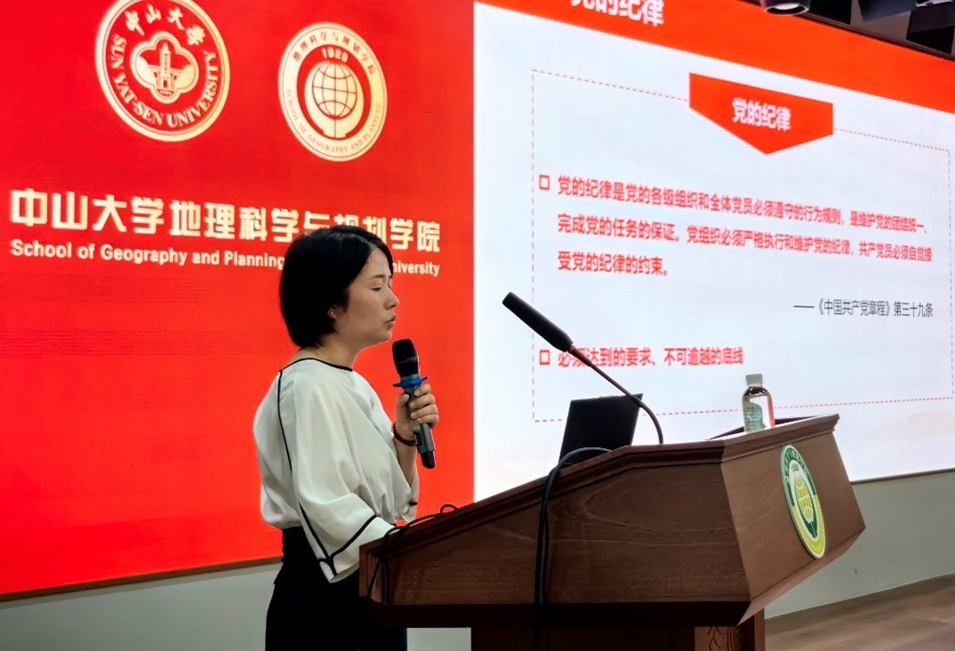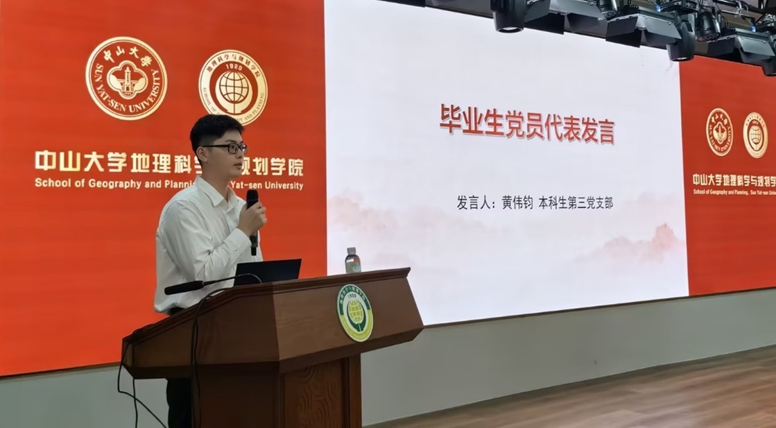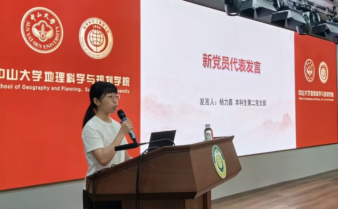 毕业生党员代表黄伟钧和新党员代表杨力嘉分别上台发言。两位优秀的党员同志分别回顾了自己过去几年学习及生活中的点滴,坚定了作为中大地理人的信念和追求。黄伟钧同志表示,在中大7年的学习生涯以及深入参与学院的党建工作,他的政治理论水平得到很大提升,党性修养和业务能力也获得长足进步,并承诺将牢记孙中山先生“为社会福,为邦家光”的训词,在学思践悟中坚定理想信念,在奋发有为中践行初心使命。杨力嘉同志表明自己成为更为优秀党员的决心,她讲到:“青年兴则国家兴,青年强则国家强。青年一代有理想、有本领、有担当,国家就有前途,民族就有希望。成为青年党员后我们肩上便多了一份沉甸甸的责任,这是党的重托也是人民的希望”。