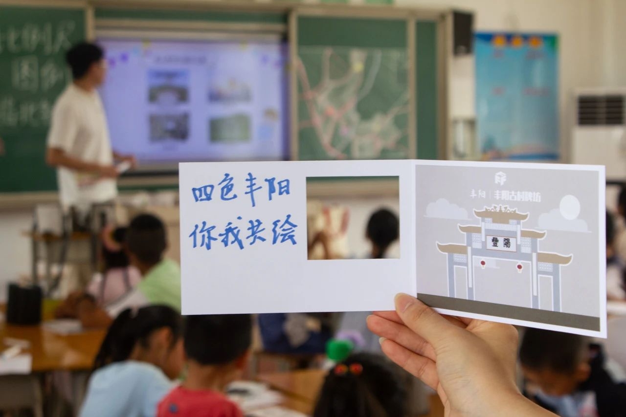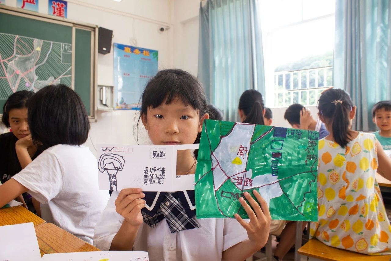 实践团成员首先用生动的案例和有趣的问题引导小朋友们走进了“地图的世界”,接着用简洁易懂的语言深入浅出的阐述了绘制地图的三大要素,随后手把手带领小朋友们用色彩斑斓的画笔一步一步地手绘出丰阳镇地图。小朋友们纷纷表示“原来,画地图也能如此有趣”。实践团还精心准备了满载丰阳风情的原创明信片,作为孩子们创意与努力的见证。孩子们兴奋地拿起笔,将对家乡的深情厚谊化作一行行稚嫩却真挚的文字,寄托在明信片之上。这不仅是对家乡的祝福,更是心灵深处美育之花的悄然绽放。实践团以专业为翼,以热爱为帆,将美育的种子播撒在丰阳的土地上,生动诠释了“以美育人、以美化人、以美润心、以美培元”的深刻内涵。
