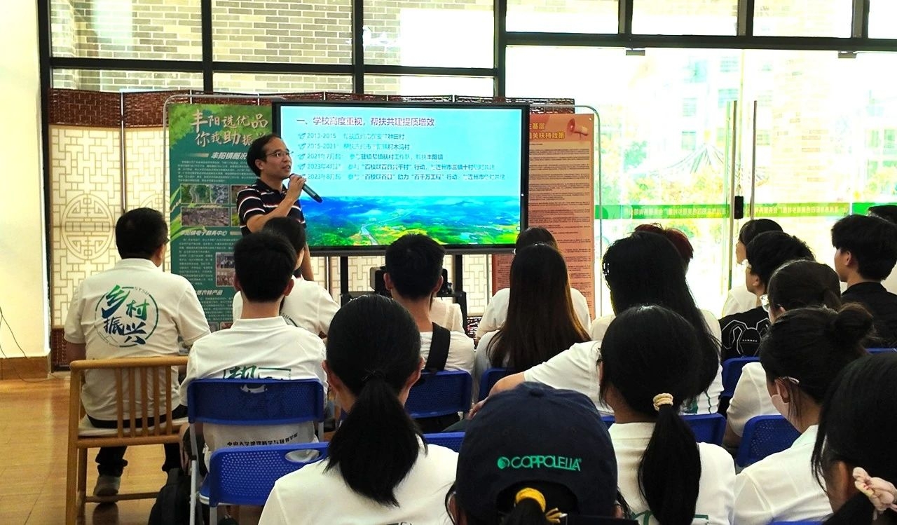 7月16日,学院实践团从东校园出征,到达丰阳镇稍作休整后,师生团队来到了丰阳镇电子商务中心,学校派驻连州工作队队长陈英群老师为师生讲授专题党课《汇聚优势资源,实现校地双赢》,就连州市丰阳镇产业情况、学校帮扶工作成效、汇聚资源优势推进七大任务、深化校地合作等内容作了全面深入的介绍。让师生团队深刻感受到了yl9193永利集团对定点帮扶和“双百行动”工作的高度重视,了解了乡村振兴工作的深远意义与丰富内涵。陈老师鼓励青年学子“在乡村振兴的大舞台上建功立业,把论文写在祖国大地上。”成员们纷纷表示将把校园内专业所学运用到乡村振兴的实践中去,在实践中锤炼本领,增长才干。