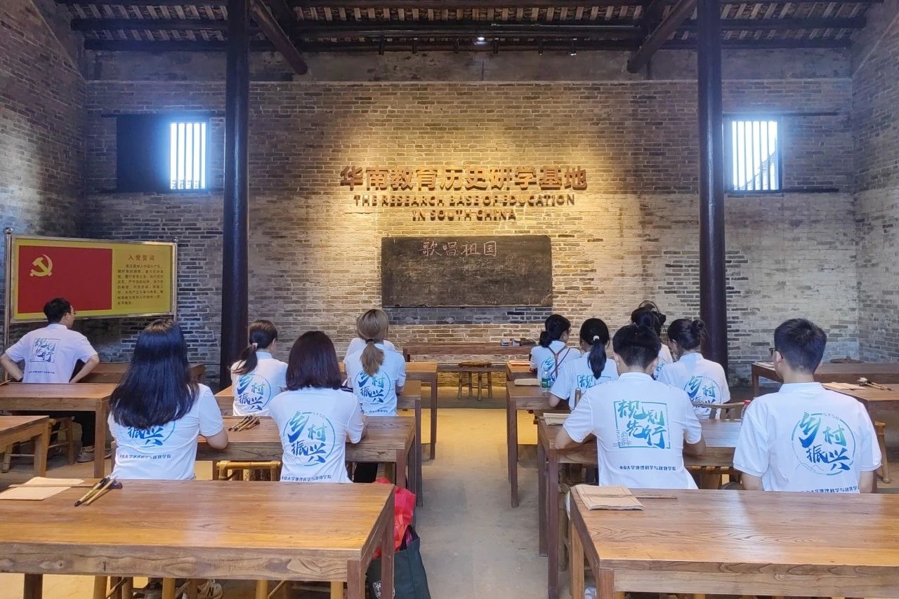 党课结束后,实践团一行前往冯达飞将军纪念馆,在讲解员的带领下了解了冯达飞将军光荣的一生。冯达飞将军坚贞不屈、为革命献身的大无畏精神感染着实践团每一位成员,故居内历史的痕迹激励着团队师生传承红色基因,倍加感恩、珍惜如今的幸福生活。随后,实践团参访了广东省立文理学院旧址,透过斑驳的砖墙与图像的细节,同学们仿佛置身于一场穿越时空的对话,感受到革命先辈艰苦求学的信念,凝聚起追求知识与真理的力量。经过这两堂生动而深刻的红色教育党课,成员们不仅加深了对乡村振兴战略的理解与认同,更在心灵深处种下了红色基因的火种。冯达飞将军的英勇事迹和广东省立文理学院旧址的历史印记,让成员们深刻认识到历史的厚重与先烈的伟大,激发了强烈的爱国情怀和社会责任感。