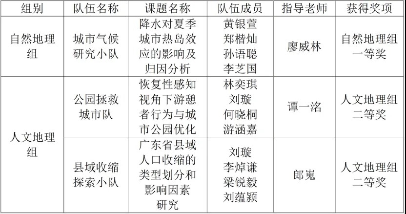 在大赛过程中,来自全国各大高校的队伍相互交流学习,在比赛中实现了自我提升。我院三支队伍在比赛中展现出中大地理学子出色的科学素养与积极向上的精神风貌,于79支队伍中脱颖而出,荣获自然地理组一等奖一项及人文地理组二等奖两项的佳绩。