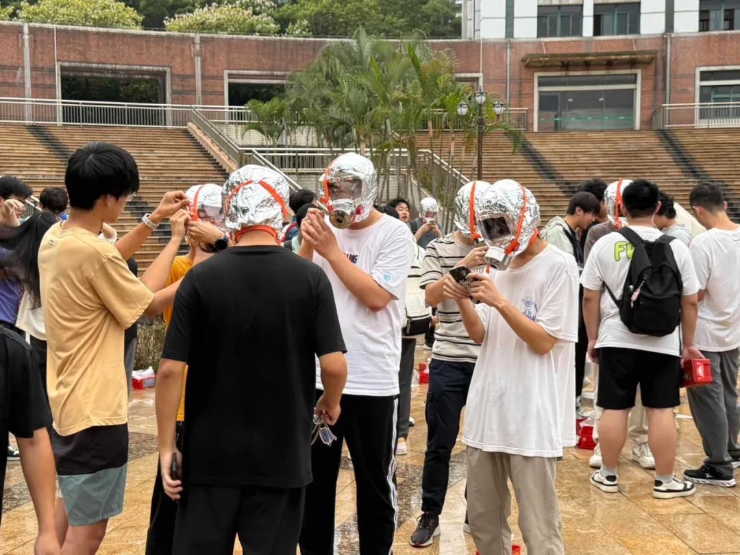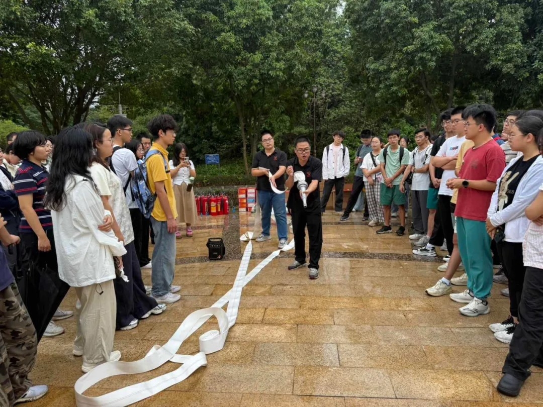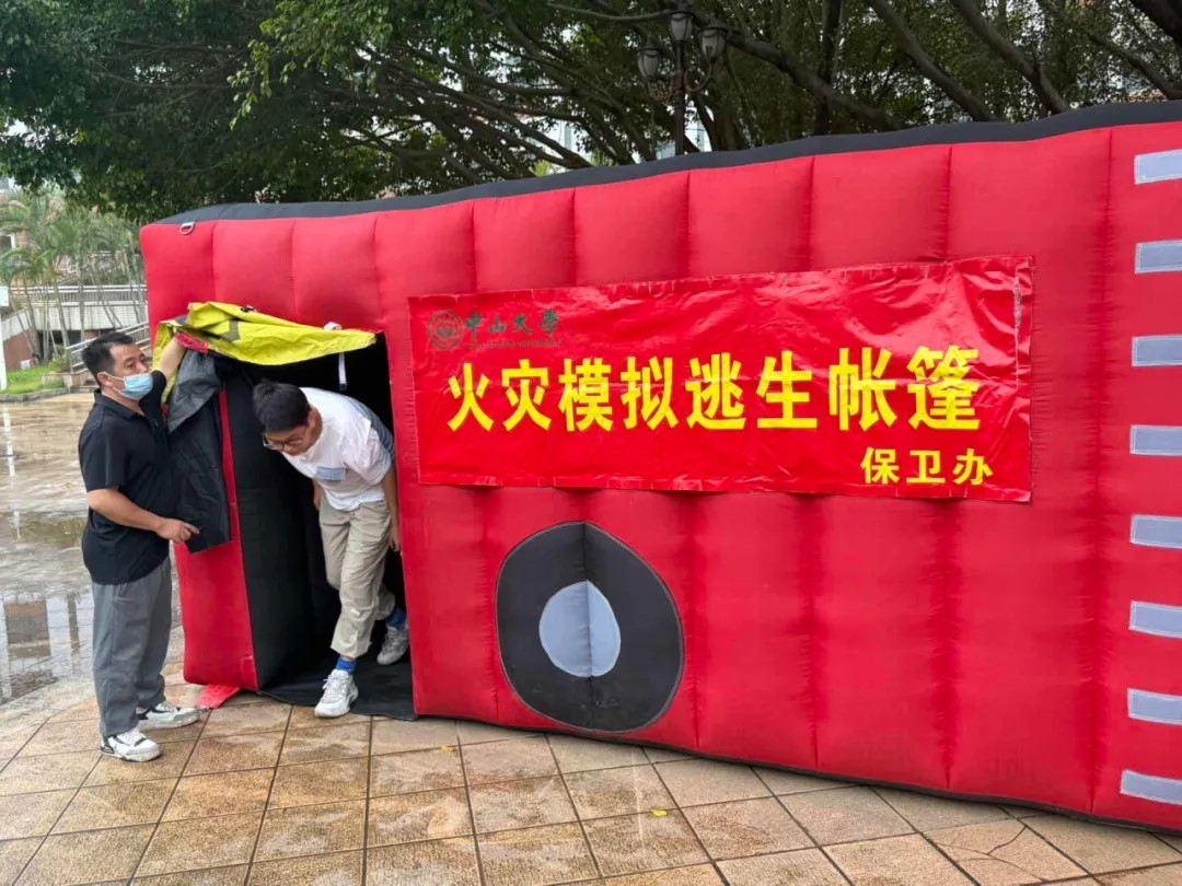随后师生们前往学院楼前广场,在广东安盾消防技术服务有限公司工作人员指导下分批进入火灾模拟逃生帐篷,身临其境地学习如何从黑暗封闭、浓烟滚滚的火灾现场逃离。