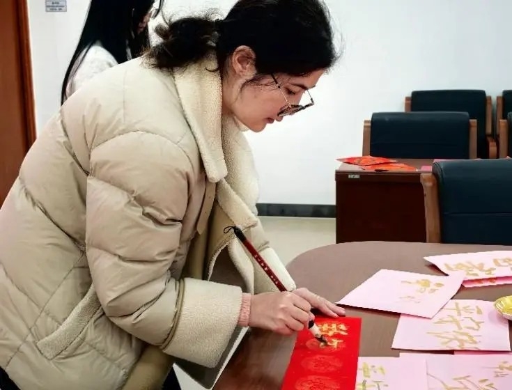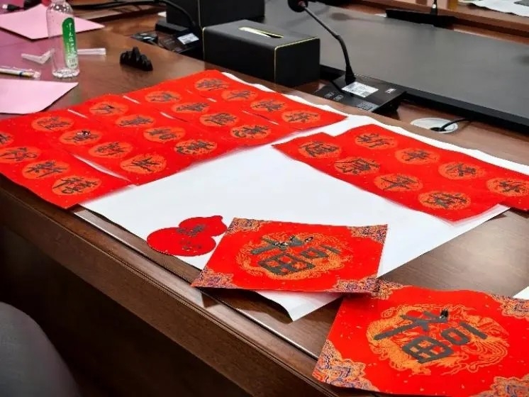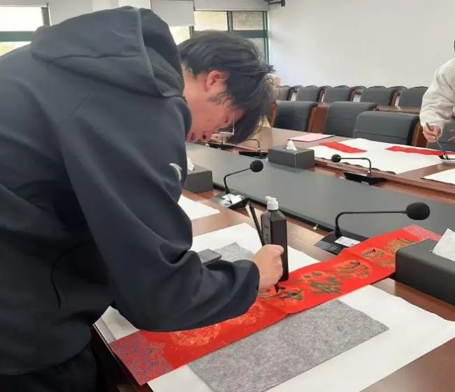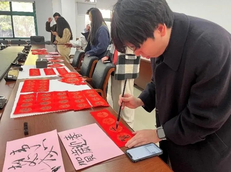 1月17日中午,地理科学与规划学院在学院B210会议室举行2025年寒假留校学生春节座谈会。学院党委岳辉书记、张春华副书记、党政专职辅导员姜帆老师、姚丹老师、青年教师专职辅导员谭一洺副教授,包括中国学生和日本、韩国、土库曼斯坦等国际学生在内的近20名学生欢聚一堂,以书写春联和座谈交流的形式共迎新春佳节。