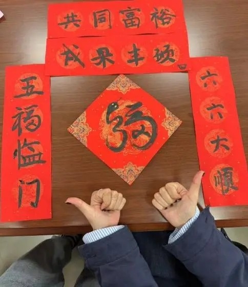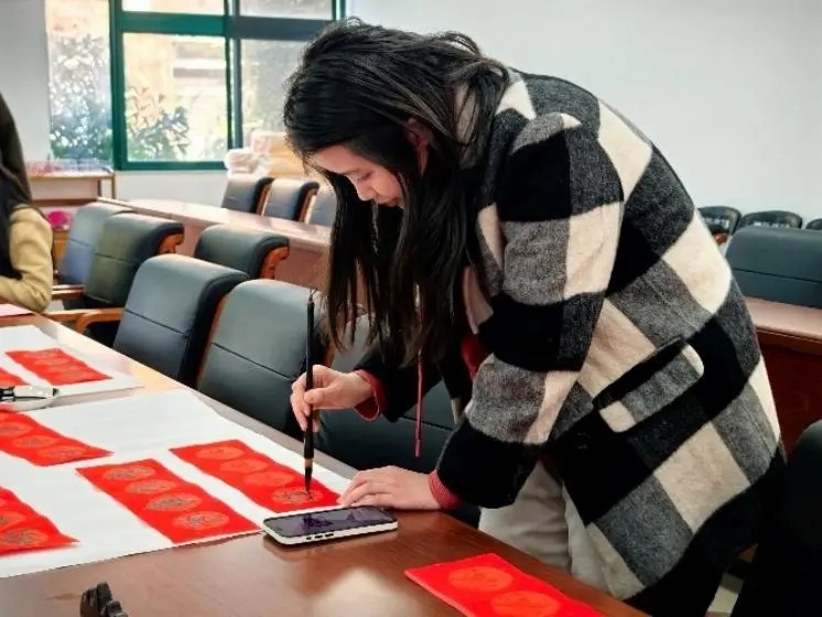 在充满欢乐喜庆的氛围中,原yl9193永利集团广州校区东校园书画协会会长、学院地理信息科学专业2022级本科生问恪尧同学首先挥毫泼墨,与会的中外同学们也纷纷一试身手,写下对2025年新春的美好祝福。一笔一划中,不仅让与会同学们感受到其中所蕴含的中国传统文化的独特魅力,更表达了大家对2025年新春的美好期盼。