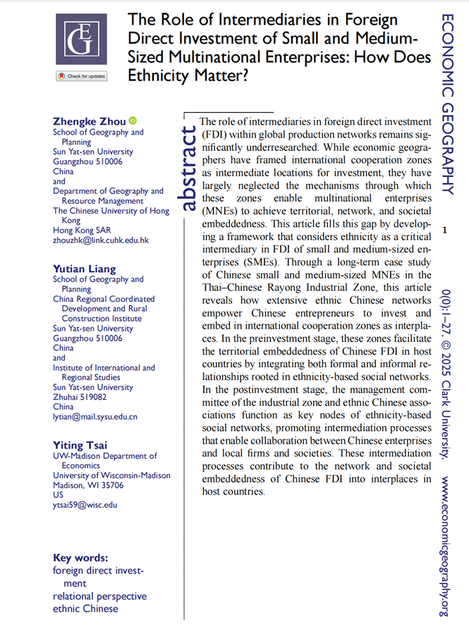 论文引用:Zhengke Zhou, Yutian Liang* & Yiting Tsai.The Role of Intermediaries in Foreign Direct Investment of Small and Medium-Sized Multinational Enterprises: How Does Ethnicity Matter?, Economic Geography, DOI: 10.1080/00130095.2025.2498764