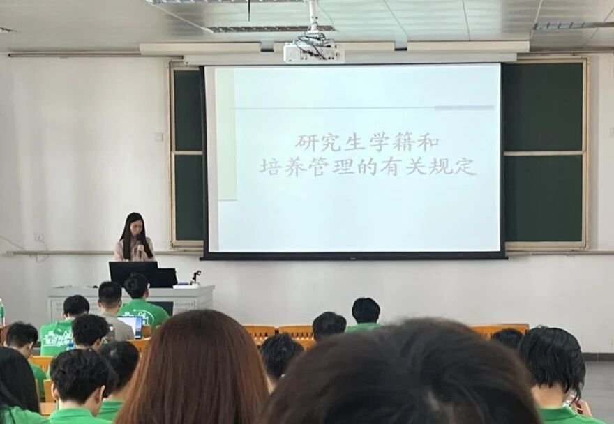 研究生秘书黄惠珍老师为新生讲解研究生学籍与培养管理相关规定,主要内容涵盖研究生培养方案、学籍培养认定、课程安排、毕业基本流程等方面,帮助大家全面了解研究生阶段的培养体系和流程。她特别提醒,各位同学必须明确学业各阶段应注意的事项与要求,结合重要时间结点安排学业计划,确保学分、成果发表及毕业相关流程的顺利进行。